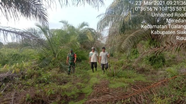 Babinsa Koramil 04/Perawang Sertu Uuk Sudarijanto melaksanakan patroli Karhutla Jl H Abdullah RT/RW 03/03 Kampung Maredan Kec. Tualang Kab. Siak Titik Koordinat : 0°36’56″N 101°35’58″E Personil Gabungan yang di Kerahkan TNI 1 orang dan Masyarakat 2 orang. Untuk Hasil tidak ditemukan Titik Api dan Asap.