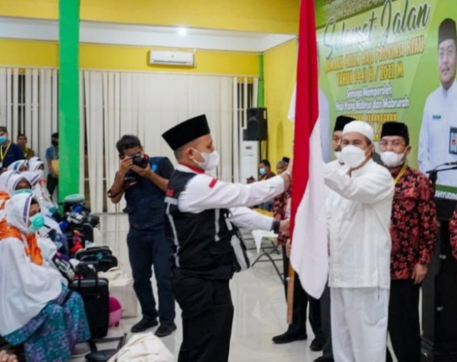 PEKANBARU (Infosiak.com) – Gubernur Riau H. Syamsuar didampingi Kepala Kantor Wilayah Kementerian Agama Provinsi Riau Dr. H. Mahyudin, MA dan Karo Kesra Sekdaprov Riau H. Zulkifli Syukur melepas 54 Jamaah Calon Haji (JCH) Kloter I Provinsi Riau yang tergabung dalam Kloter 04 BTH, Sabtu (18/06/2022), di Aula Keberangkatan Embarkasi haji Antara (EHA) Riau.